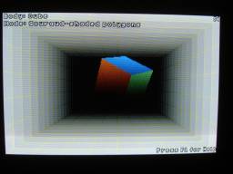 This is a vector graphics demo which displays three-dimensional solid objects rotating, moving around, and bouncing against the walls of a room, using a few different drawing modes.