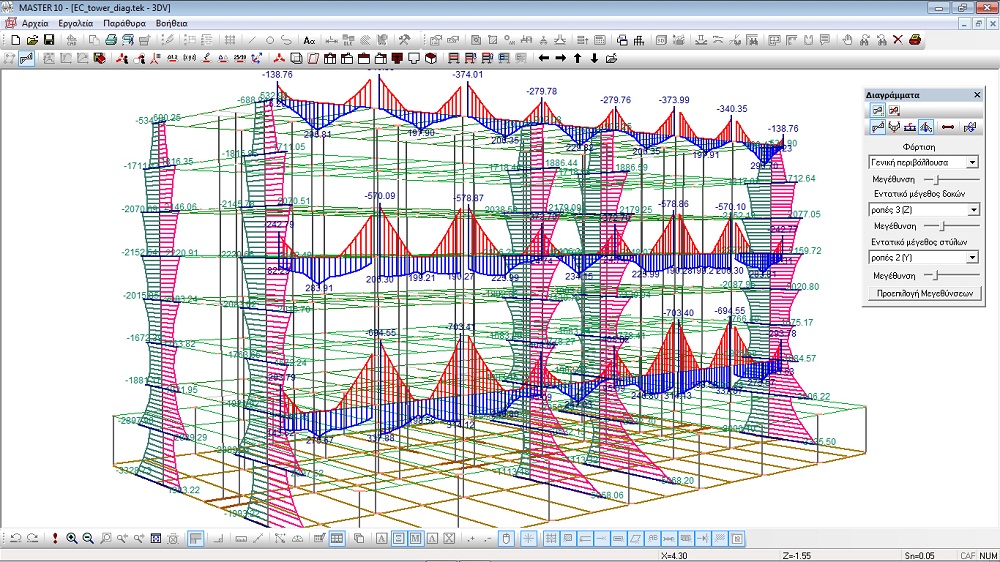 In the above picture we can see 3DV maximized, showing various kinds of force diagrams along horizontal and vertical members of a building rendered with perspective.