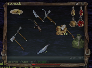 The backpack window contains an instance of the Darkfall Inventory Control. It displays the items that the player is carrying with him. It may contain other containers, (i.e. a bag) which may in turn contain other containers ad infinitum. The percent-bar at the bottom shows how full the backpack is.