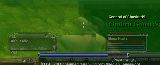 In the following picture I have my crosshairs on another player, and I can see their rank, the clan they belong to, their name, and their health. The target info window tells me that the other player is an Alfar Male, in case I had not noticed.