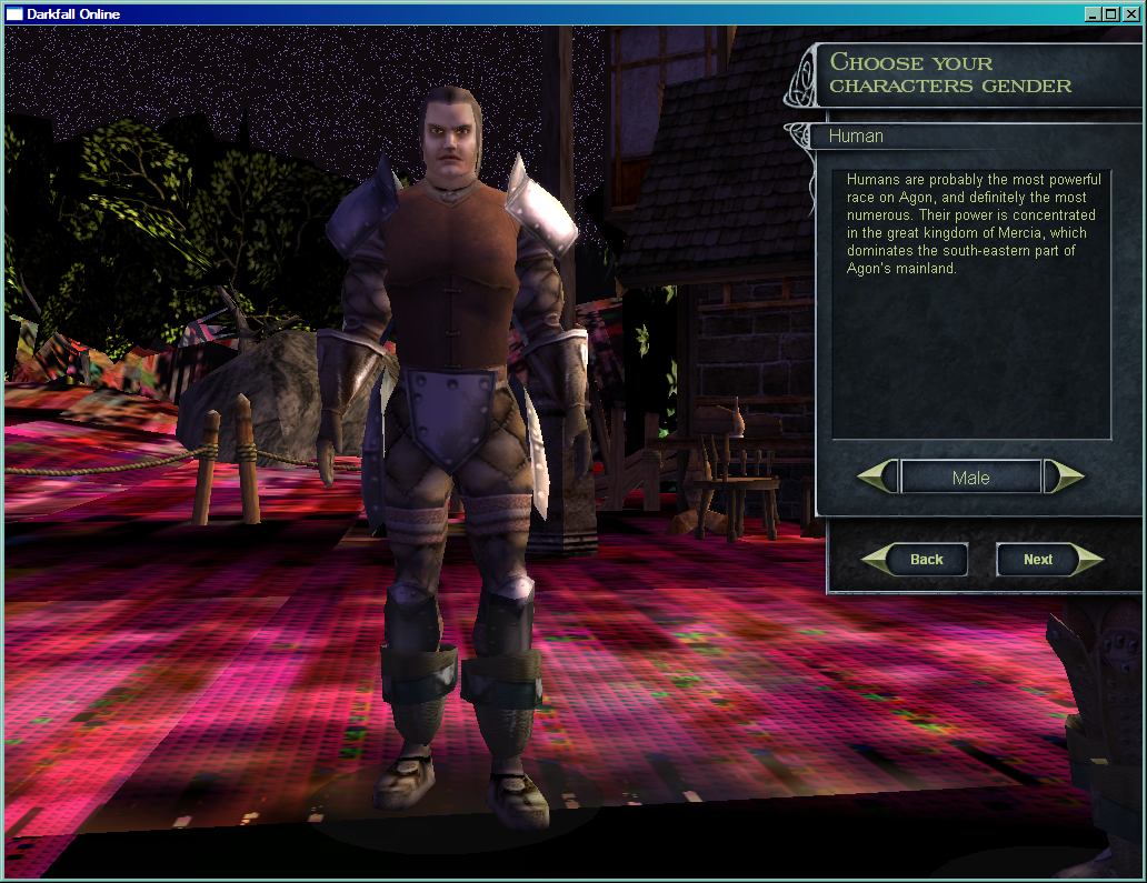 The following is a screenshot of the Character Creator, a module built by a colleague on top of my framework to allow players to customize their characters when first starting the game. This particular screenshot is taken from a development environment where some of the textures happened to be kind of messed up, so it is unique in a special way.