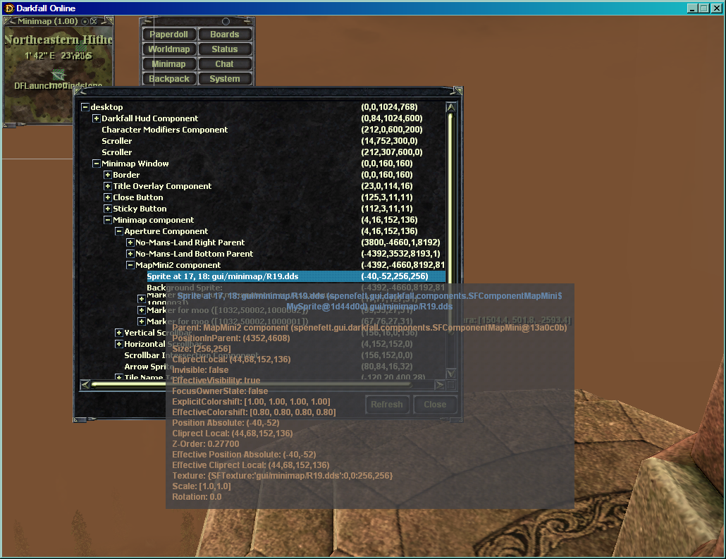 One window which you will not see in Darkfall is the GUI Debug window, because it is only available in the debug build of the game. It contains a tree control which displays the entire window hierarchy of the GUI, from the desktop component (the root) all the way down to the individual texture components (the leaf nodes) of which everything is comprised. A blinking frame is displayed around the original (unclipped) rectangle of the selected component, (in this case, one of the textures that make up the minimap,) and a tooltip shows extensive information about it. It is very useful for troubleshooting all kinds of issues that may pop up in the GUI during the course of development.