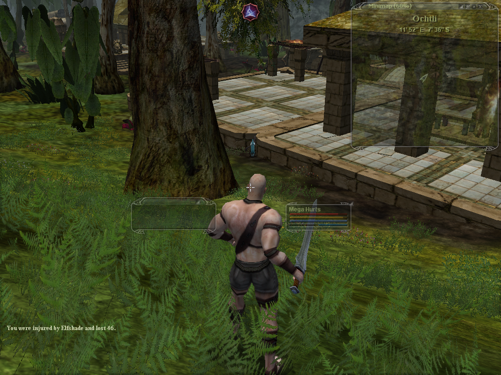 Another very important component of the Darkfall GUI is the HUD component. It contains the crosshair texture and it shows information about the item or player that is at any given moment pointed at. Darkfall is unique among MMORPGs in that it takes a first-person-shooter approach, and therefore the crosshair is the player’s center of attention most of the time. For this reason, while playing the game I used to keep my targeting component (showing even more information about the targeted item) and my vital stats component (showing my health, my stamina, etc.) very close to the crosshair so as to be able to check their contents without much eye movement.
