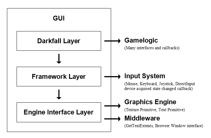 What follows is a rough diagram of the design of the GUI that I built for Darkfall: The graphics engine (written by a colleague in C++) provided me with just two asynchronous primitives, one for drawing textures, and one for drawing text. The layer we called middleware (written by another colleague, also in C++) provided me with the functionality of the “GetTextExtents” Win32 GDI function, and with an interface to the browser window (encapsulated instances of Microsoft Internet Explorer.)
