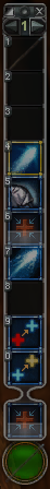 The following two pictures show the hotbar window. It is a matrix of 10 by 10 placeholders where you can put all your weapons and spells for quick access, and where your currently selected weapon and currently selected spell are displayed. There is a set of key bindings for selecting which one of the 10 columns will be visible, and another set of key bindings for activating one of the 10 items in the currently visible column. In the first picture we can also see a progress overlay which shows that a certain spell is recharging, giving us a visual indication of how long it will take before we can use it again. The second picture shows the fully unfolded view of the hotbar, which is primarily used for dragging and dropping items from other inventory windows and from the spells window.
