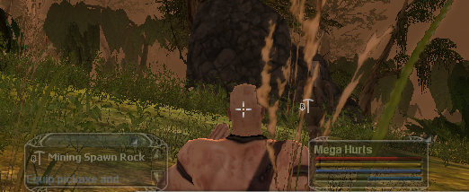 In the following picture I have my crosshairs on a rock outcrop; the HUD informs me that the pickaxe can be used on that item, and the target info window gives me more information about it.