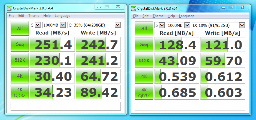 These two side-by-side screen captures are from CrystalDiskMark measuring the performance of my brand new Samsung 850 PRO 256GB Solid State Drive (C:) versus the performance of my old Seagate Barracuda 1TB 7200 RPM 32MB Cache Hard Disk Drive (D:). Higher numbers are better.