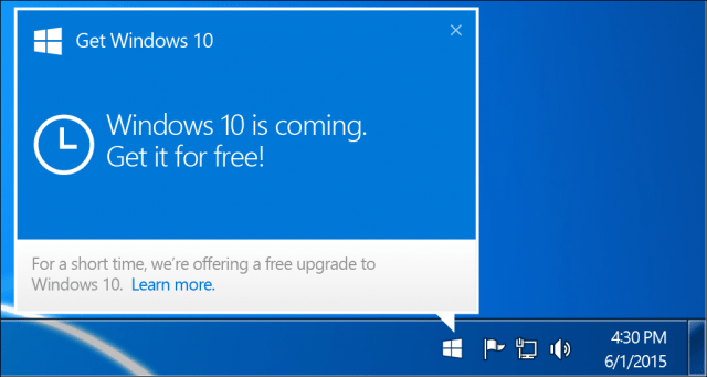 So, Microsoft has pushed this trojan horse to every single user of Windows on the planet. It displays a Windows 10 logo on the taskbar, and it is basically telling you that not only you will get Windows 10 as soon as it comes out, but you should right now begin acting as if you are looking forward to it. Because, you know, you are their biatch.