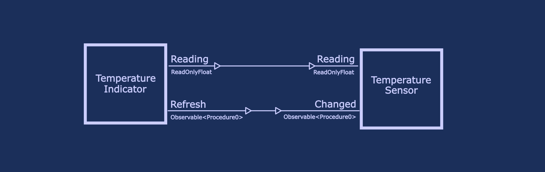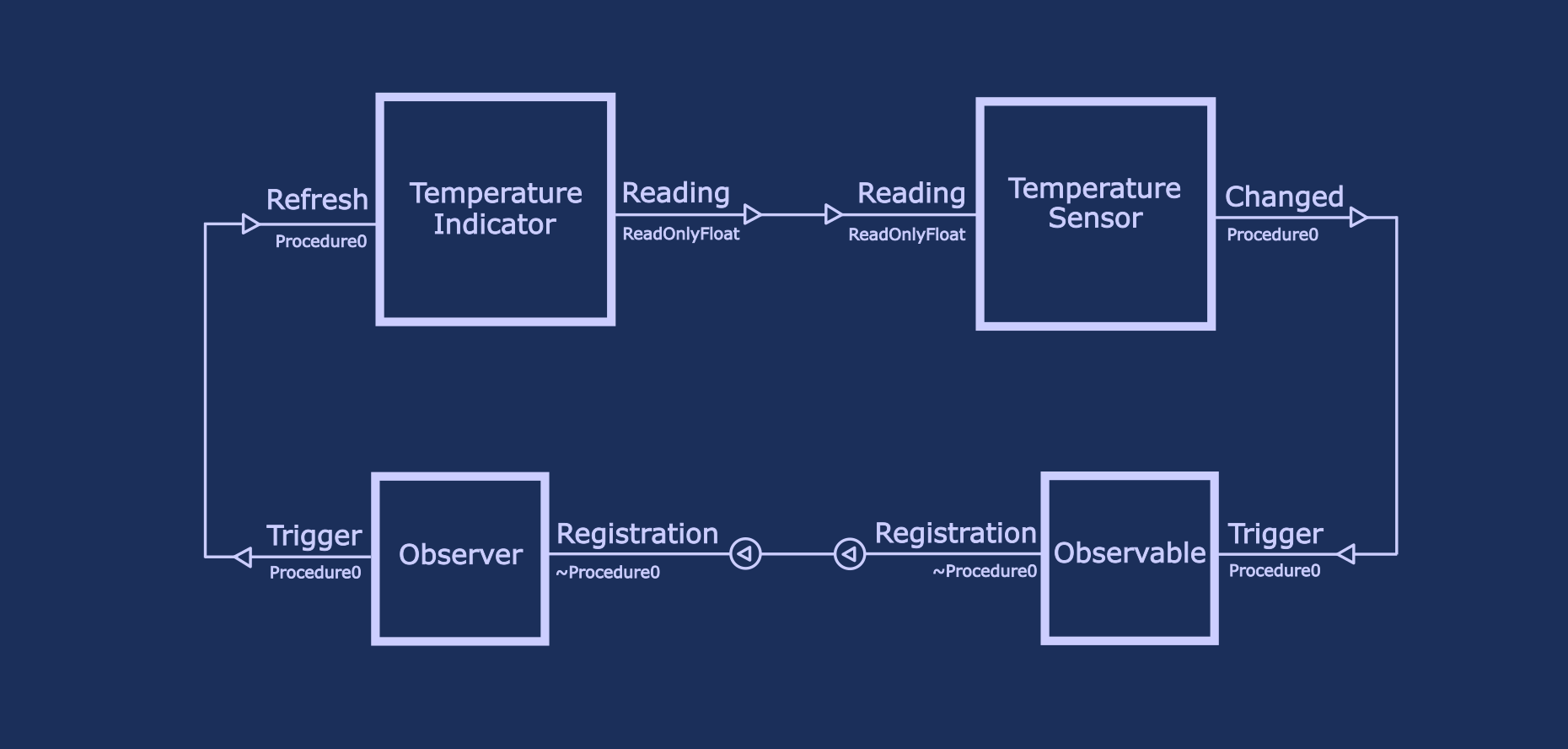 - Has an output called Changed, of type Procedure0 (same thing as the "Runnable" of Java or the "Action" of C#) that it invokes in order to indicate that the value of the temperature has changed.